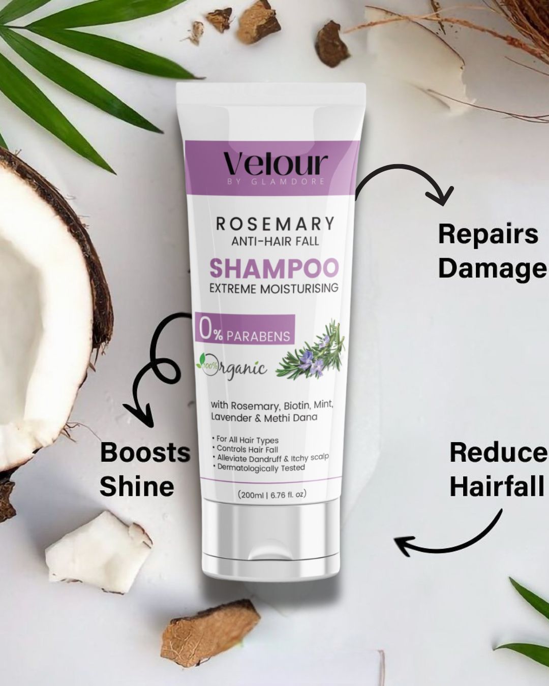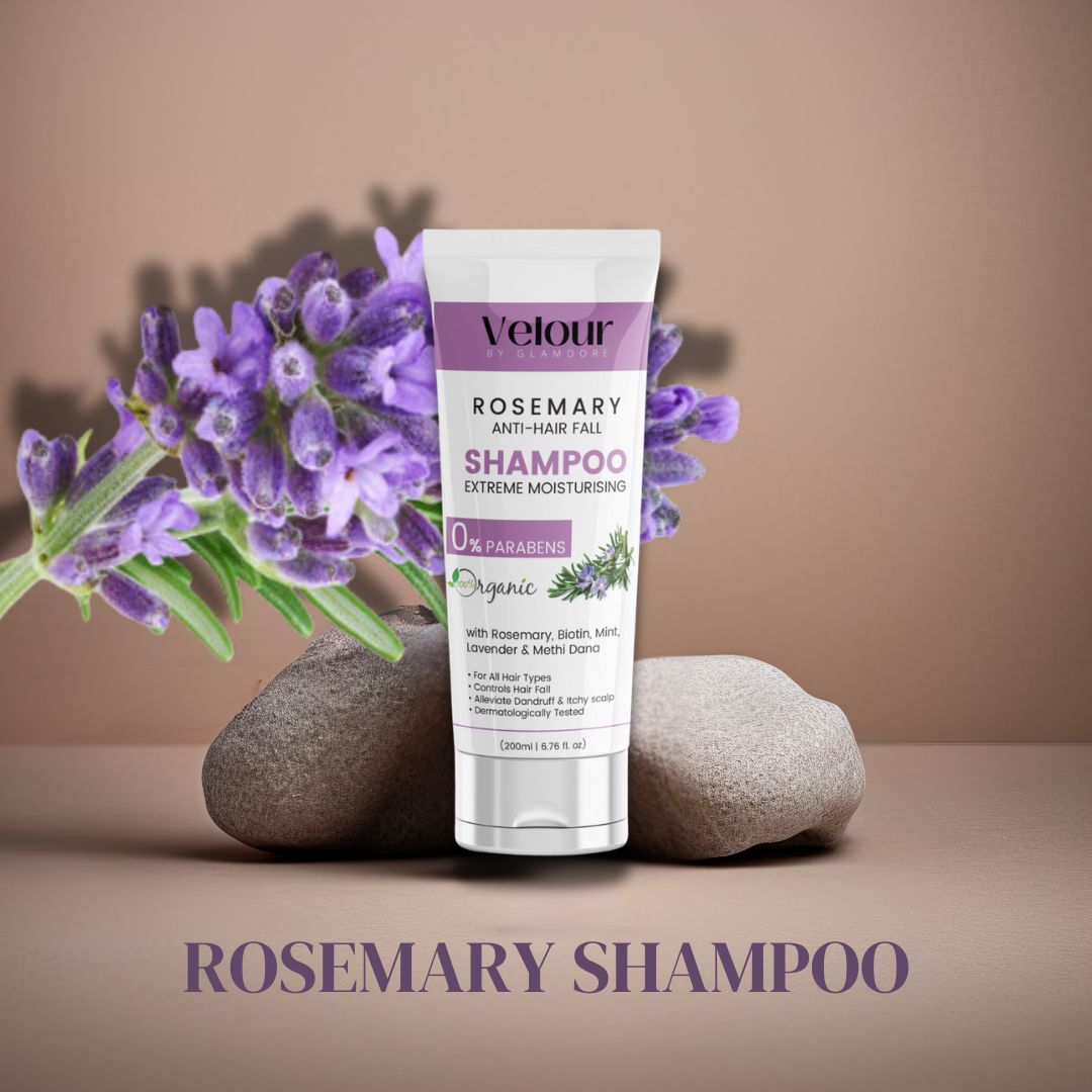 Say goodbye to hair fall and hello to stronger, healthier hair with Velour by Glamdore Rosemary Anti-Hair Fall Shampoo! Formulated with Rosemary, Biotin, Mint, Lavender, and Methi Dana, this 100% organic shampoo deeply nourishes the scalp, strengthens hair follicles, and promotes hair growth. Its paraben-free formula provides extreme moisturization while soothing dandruff and an itchy scalp.